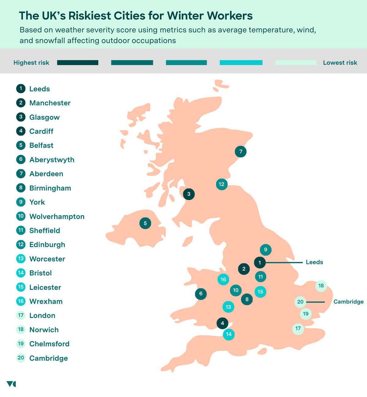 To identify the UK cities where winter poses the greatest challenge for outdoor workers, we analysed weather data across six key climate indicators known to increase physical strain and reduce worker comfort and safety during colder months: